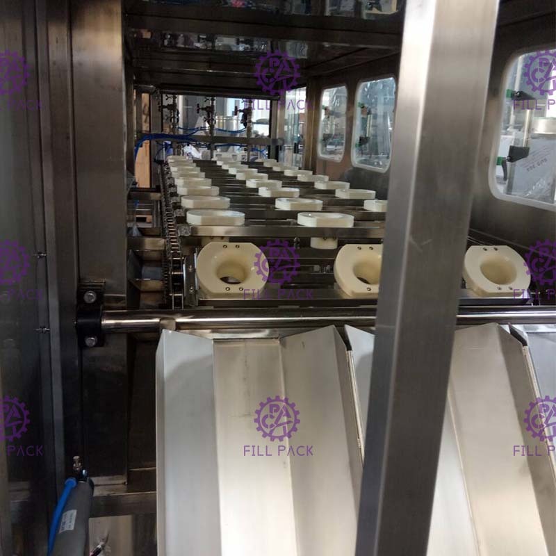 Cuando se completa el llenado, el mecanismo de accionamiento del cubo envía el cubo lleno de agua a la cubierta de la máquina de tapón, y cuando la tapa con tapa se transfiere al mecanismo de tapón,el cilindro de tapón presiona el tapón, y así, un lavado y lavado El ciclo se completa.