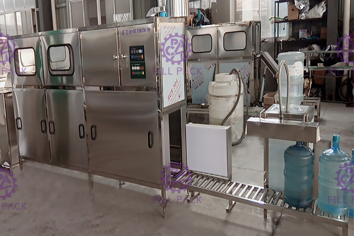 Toda la planta de embotellado de agua de 5 galones incluye un desembotellador y una lavadora semiautomáticos, un enjuagador-rellenador-embotellador monobloque, un transportador de rodillos, un túnel de contracción de etiquetas, una luz de verificación, una máquina de codificación de rollos de tinta sólida