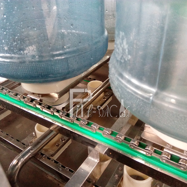 3) La máquina de rellenar 20L bajará 45 grados a través de la cadena de paso y pasando hacia fuera la cadena y volcará 45 grados por el cilindro de la elevación del barril a la posición de relleno para llenar.