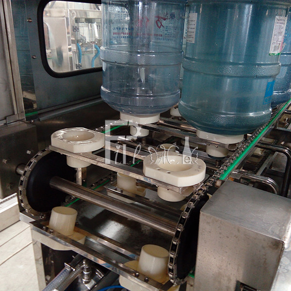 la máquina de rellenar del agua de botella de 5 galones se puede dividir en 3 pasos: lavándose, llenando y capsulando, estaciones de trabajo del total 36, proceso de trabajo como abajo: