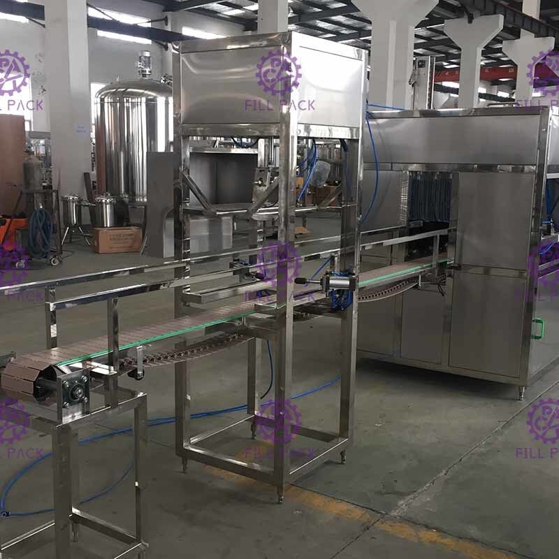 Cuando la botella de galón entra en la máquina, el cabezal descapuchador bajará y el dispositivo de garra sujetará firmemente los lados de la tapa del barril, y luego levantará el barril para quitar las tapas; Y cuando las tapas se quitan, el aire del compresor soplará las tapas en la tolva de tapas, luego caerán afuera en el soporte del cliente;