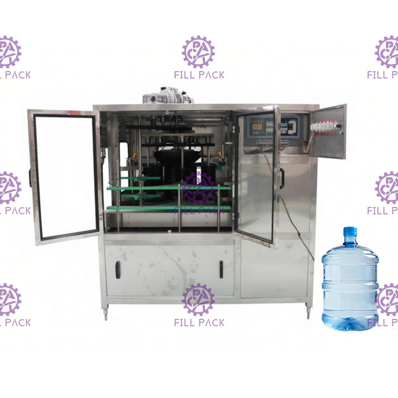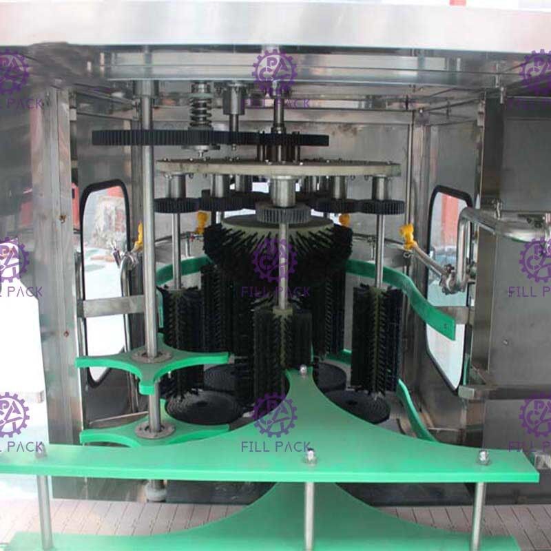 La máquina está completamente bloqueada para detener la fuga de agua, cuando las botellas de galón se envían a la posición de lavado, el cilindro detendrá 3 botellas en el interior y fijarlos por pinceles y barra de fijación,el agua será bombeada y arrojada al cuerpo de la botellaLas botellas se limpiarán con pinceles y función de agua.