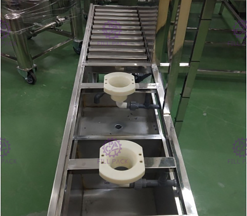 6) Después de llenar el bidón, luego mover a la plataforma operativa de la taponadora, liberar la tapa manualmente con una glándula artificial.